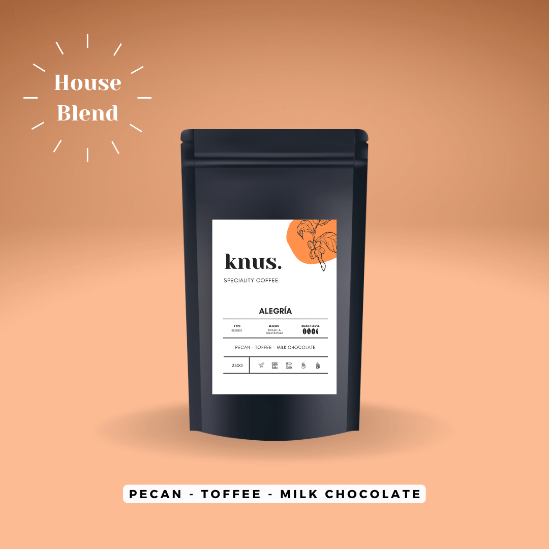 Alegria is our House Blend. It's a two-bean speciality Arabica blend with beans from Guatemala grown in the volcanic soils of tropical valleys and coffees from Cerrado Minas Gerais in Brazil. A medium-bodied espresso of soft acidity, maple syrup sweetness and hints of pecan. As a milk-based coffee, this blend presents milk chocolate and toffee flavours, ensuring a deliciously smooth coffee.