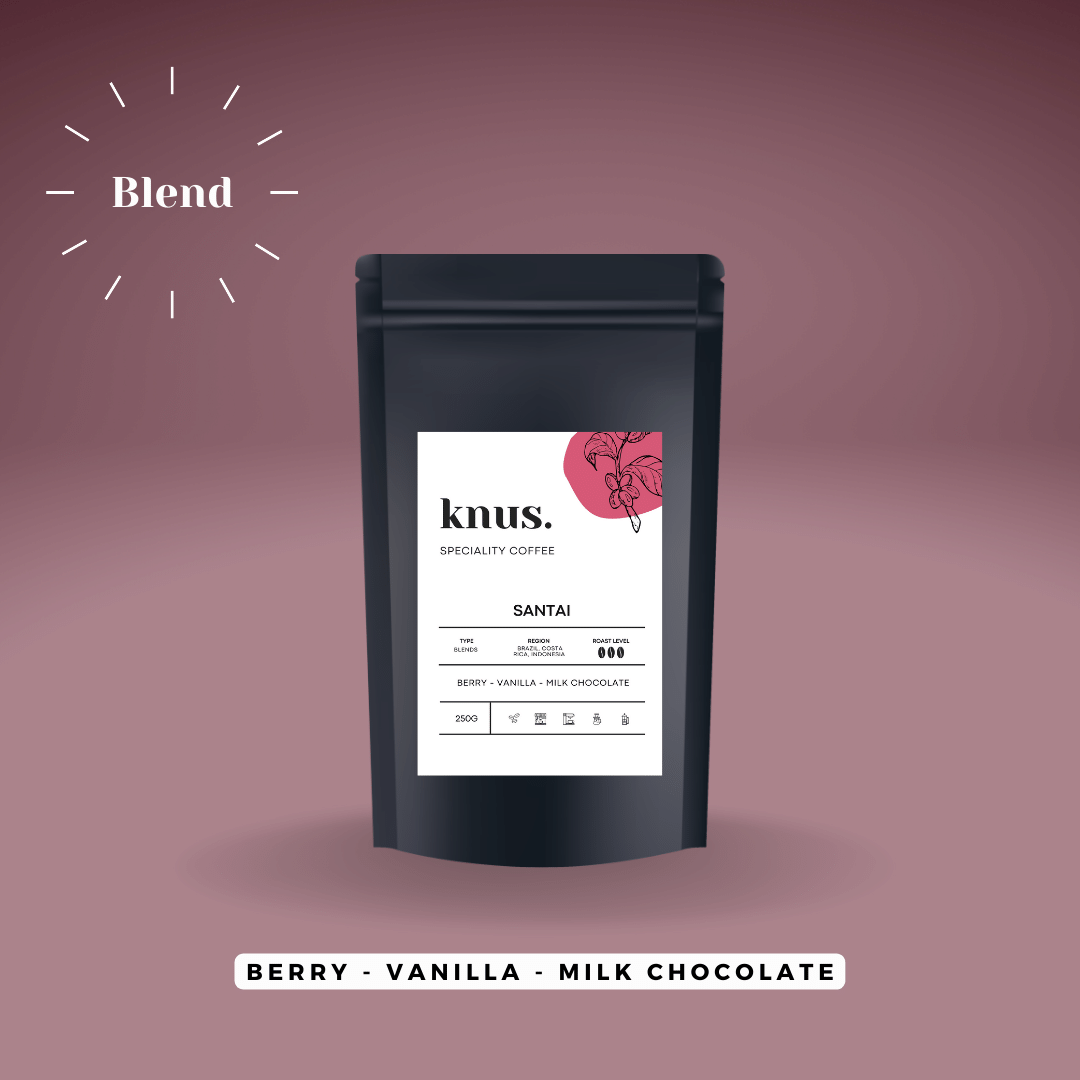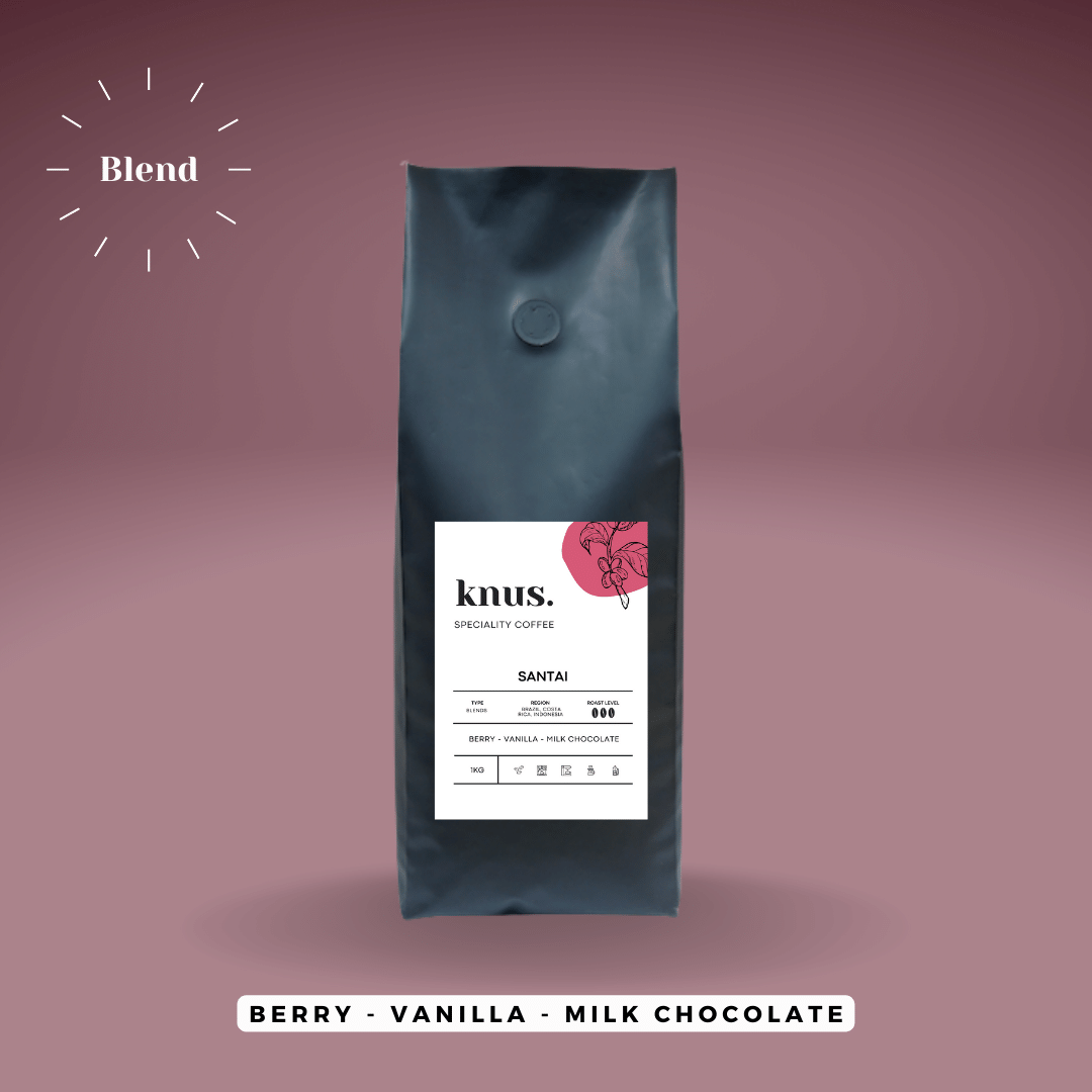 Santai is a blend of the finest arabica speciality beans sourced from coffee farms in Brazil, Costa Rica and Indonesia. A sweet and complex blend with a velvety body, resulting in a vibrant espresso with berry and stone fruit aromas. As a milk-based coffee, Santai is smooth and mellow with sweet vanilla and milk chocolate flavours.